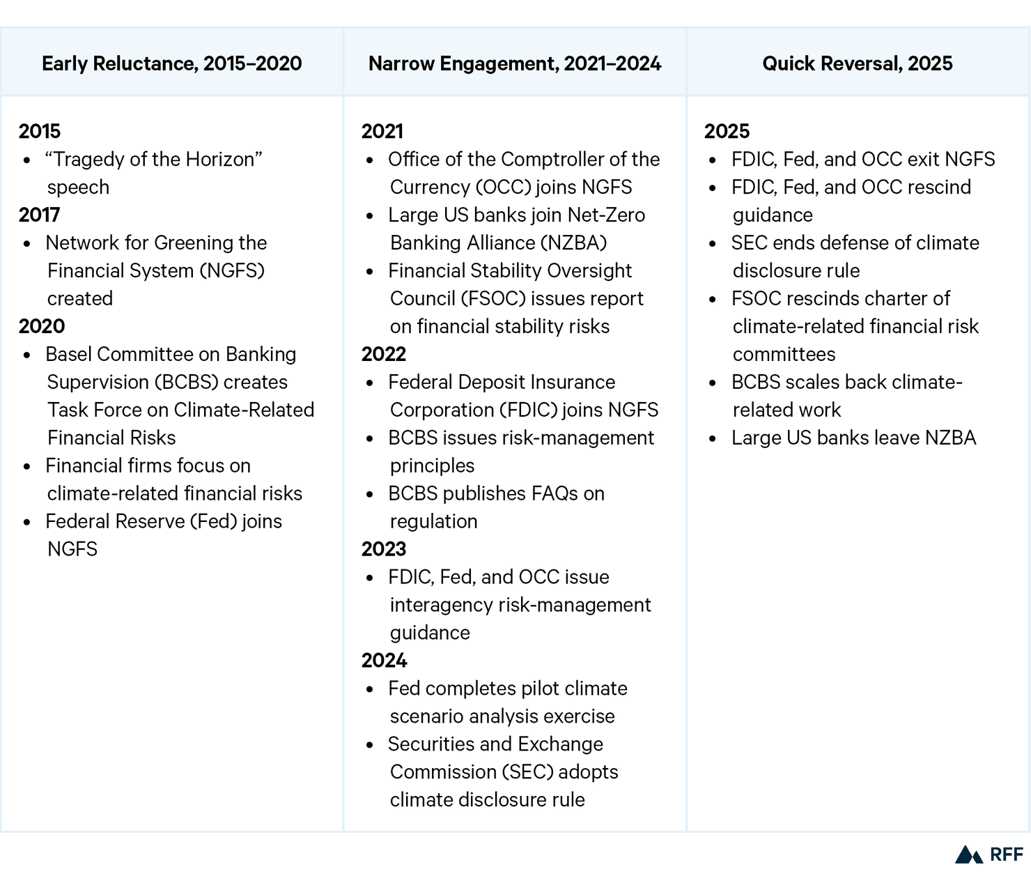 2025: Quick Reversal. Beginning in 2025, US regulators quickly pulled back as the Federal Deposit Insurance Corporation, Federal Reserve, and Office of the Comptroller of the Currency exited the Network for Greening the Financial System and rescinded the interagency guidance, while the Securities and Exchange Commission voted to end defense of its climate disclosure rules. The Financial Stability Oversight Council rescinded the charter of two climate-related committees and warned of mission drift that could lead to an excessive focus on climate risk and the effective debanking of certain industries. At the same time, the Basel Committee on Banking Supervision’s oversight group narrowed the remit of climate-related work. Large US banks exited the Net-Zero Banking Alliance, which subsequently ended activities, and generally reduced public discussions about climate-related financial risks.